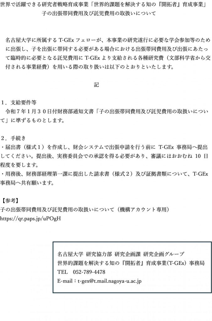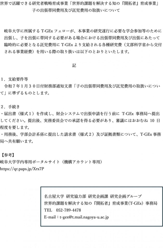 令和7年1月30日付の名古屋大学財務部通知「子の出張帯同費用及び託児費用の取扱いについて」を受け, T-GExから支給される各種研究費を支出財源とする場合の取扱いについて, 添付文書のとおりお知らせいたします。なお, 本取扱いは, 岐阜大学に所属するT-GExフェローについても同様に適用されます。